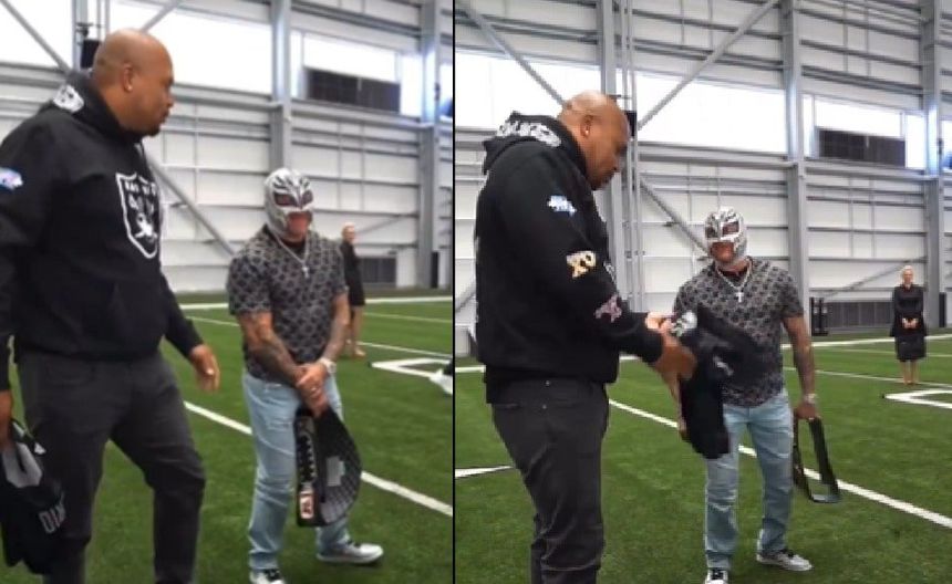 Vaya regalo se llevó Rey Mysterio en su visita a los Raiders, el mexicano fue recibido durante un entrenamiento del equipo y recibió algunos obsequios.