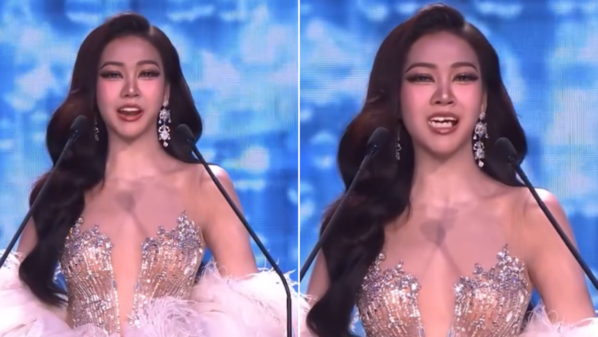 🚨WOW: a major Thai beauty pageant contestant Kamolwan Chanago's prosthetics teeth slip out mid-speech.