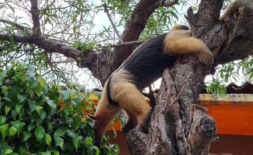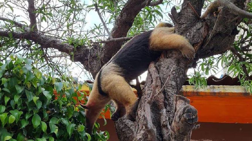 El oso hormiguero fue rescatado de un árbol por la policía y el Cuerpo de Bomberos, y luego trasladado al Centro de Integración de Vida Silvestre.