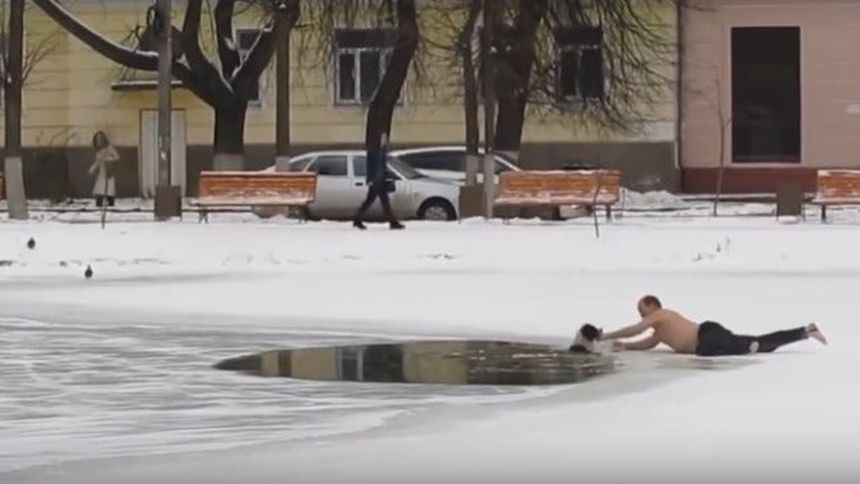 Un hombre semidesnudo rescató a un perro atrapado en un río congelado de Rusia.