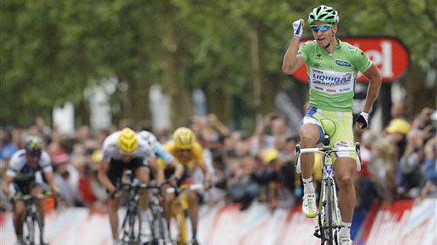 Sagan ganó su segunda etapa en el Tour al acelerar cuando faltaban 300 metros para la meta y cronometrar 4 horas, 42 minutos, 58 segundo. El noruego Edvald Boasson Hagen lo escoltó a un segundo, y el eslovaco Peter Velits arribó tercero con el mismo tiempo.