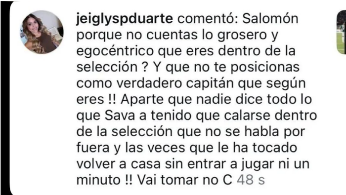 Salomón, ¿por qué no reconoces lo grosero y egocéntrico que eres dentro de la selección? ¿Y por qué no te posicionas como el verdadero capitán que, según dices, eres? Aparte, nadie dice todo lo que Sava ha tenido que aguantarse dentro de la selección, que no se habla por fuera, y las veces que le ha tocado volver a casa sin entrar a jugar ni un minuto. Vai tomar no c…”, escribió Paola Duarte, pareja de Jefferson.