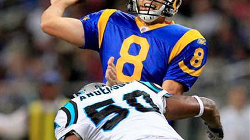 Sam Bradford conectó dos pases para anotación y la defensiva de los Carneros de San Luis hizo el domingo que las Panteras de Carolina perdieran cuatro balones y el partido por 20-10.