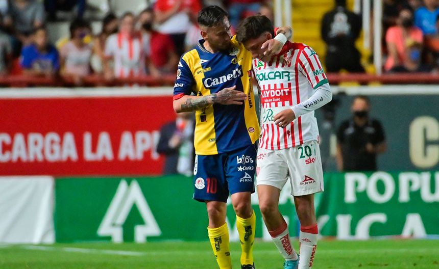 Heriberto Jurado recibió la tarjeta roja en la goleada del Necaxa sobre el Atlético de San Luis y abandonó el terreno de juego entre lágrimas, al mismo tiempo que era consolado por Rubens Sambueza.