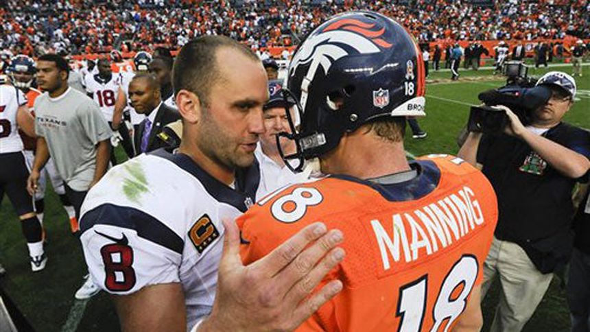 Matt Schaub superó a Peyton Manning el domingo, lanzando cuatro pases de anotación contra una confundida defensiva de Denver para guiar a los Texanos de Houston a la victoria 31-25 sobre los Broncos.
