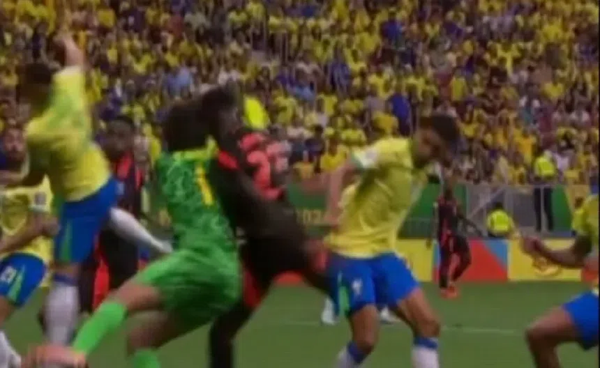 En un tiro libre a favor de Colombia, el defensa central, Dávinson Sanchez, sufrió un golpe brutal con el portero de la Verdeamarela, Alisson Becker. Ambos jugadores chocaron sus cabezas, cuando el portero salió por el balón, se llevó de frente al colombiano.