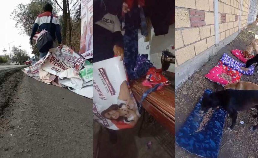 A través de la red social TikTok se ha hecho viral el video de un joven identificado con la cuenta @Che_p38, quien señala que después de que le fuera negada la solicitud de recursos gubernamentales para emprender un proyecto de cuidado animal, encontró en todas esas lonas y carteles de candidatos a un puesto público, el material para fabricar cómodas camas que pueden disfrutar sus mascotas.