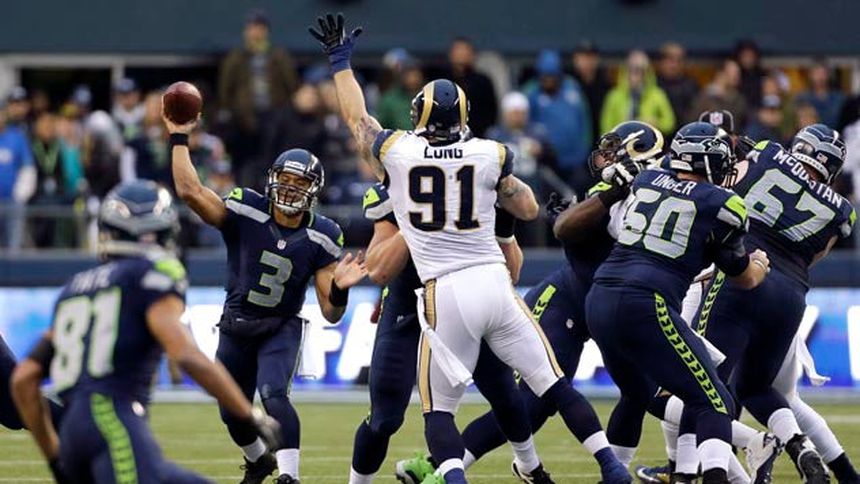 Russell Wilson empató el récord de más pases de touchdown para un novato, con 26; y su acarreo de 1 yarda para TD a 1:39 le dio a los Halcones Marinos de Seattle una victoria de 20-13 sobre los Carneros de San Luis y un récord de 8-0 en casa.