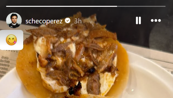 Checo compartió una historia en donde se ve un plato de tacos con salsa y verdura, lo que da a entender que el piloto mexicano disfruta de sus tiempos libres tras haber participado en el Gran Premio de China.