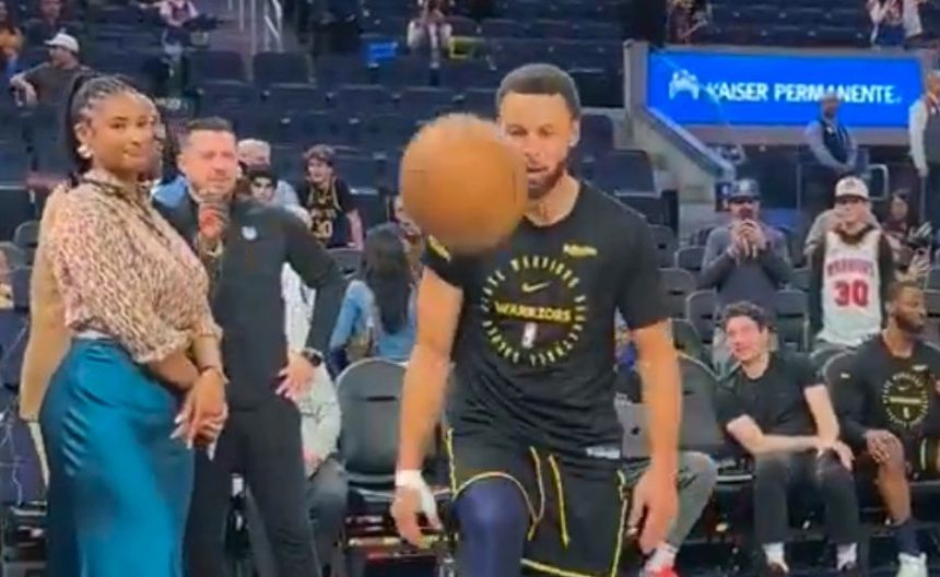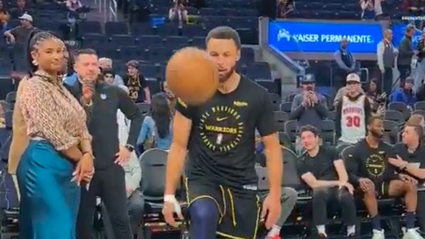 ¡Sí le sabe! Stephen Curry realiza dominadas con balón de basquetbol en calentamiento