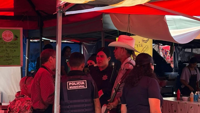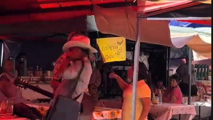 El incidente quedó registrado en un video que circula en redes sociales, donde se observa al artista ambulante caminar entre los puestos mientras interpreta música con una guitarra y una bocina portátil.