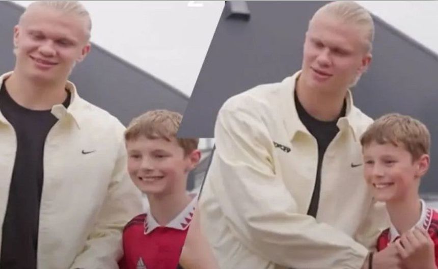 Al recordar que el niño traía una playera del Manchester United, Erling pidió que se volvieran a tomar una foto, pero ahora, el noruego tapó el escudo de los Red Devils en forma de juego.