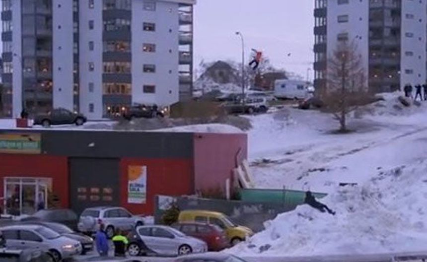 El islandés, Halldor Helgason, desafió el peligro de una manera peculiar. El snowboarder realizó un espectacular salto entre dos edificios.