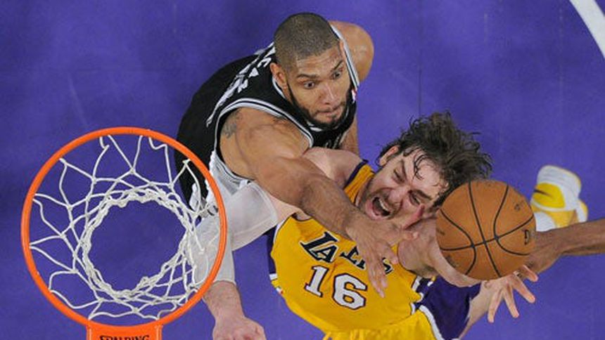 Tim Duncan registró 26 puntos y nueve rebotes, y los Spurs de San Antonio empujaron a los Lakers de Los Angeles al borde de la eliminación en la primera ronda de la postemporada al vencerlos por 120-89 en el tercer juego, siendo la peor derrota en casa durante playoffs en la historia de la franquicia.