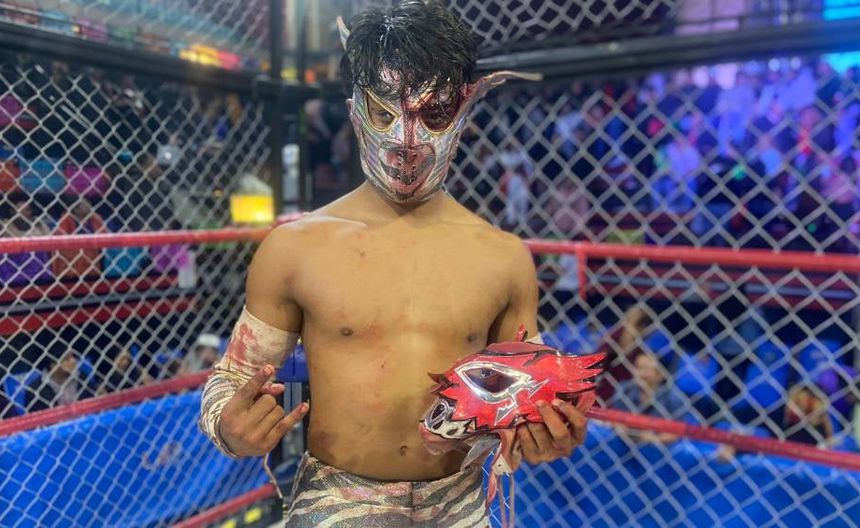 16 luchadores se metieron a la jaula para apostar su incógnita, y el último en salir fue Águila Roja, quien se dijo llamar Luis García Andrade, con 25 años de edad al entregarle su tapa a Spyder Fly.