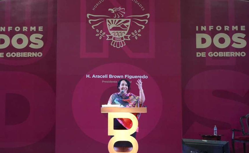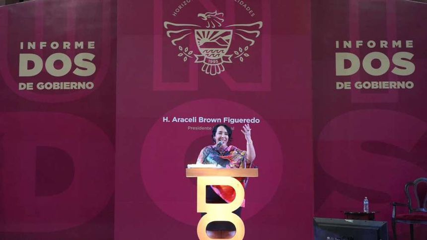 Durante su entrada, se escuchó la voz de un hombre que destacó la carrera política de Araceli Brown y su incansable lucha por la justicia social en Playas de Rosarito, municipio ubicado en el estado de Baja California. Se resaltó que la edil morenista es una mujer que "no se deja" y que trabaja arduamente junto al Presidente Andrés Manuel López Obrador "todos los días" en beneficio de su municipio.