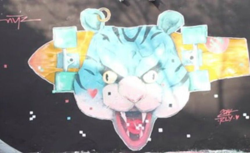 El artista azteca dibujó la cabeza de un tigre azul sobre una patineta amarilla, en una pared aledaña a una mini rampa donde los skaters de la zona practican acrobacias.