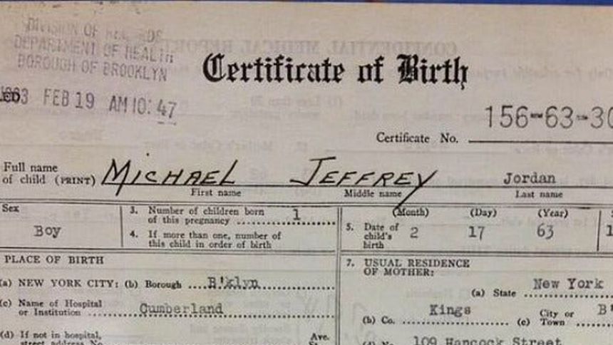El certificado muestra el nombre completo de Michael Jordan, además de su peso al nacer y su estatura. También muestra los nombres de sus padres y el oficio de éstos, además de la dirección donde vivía la familia Jordan.