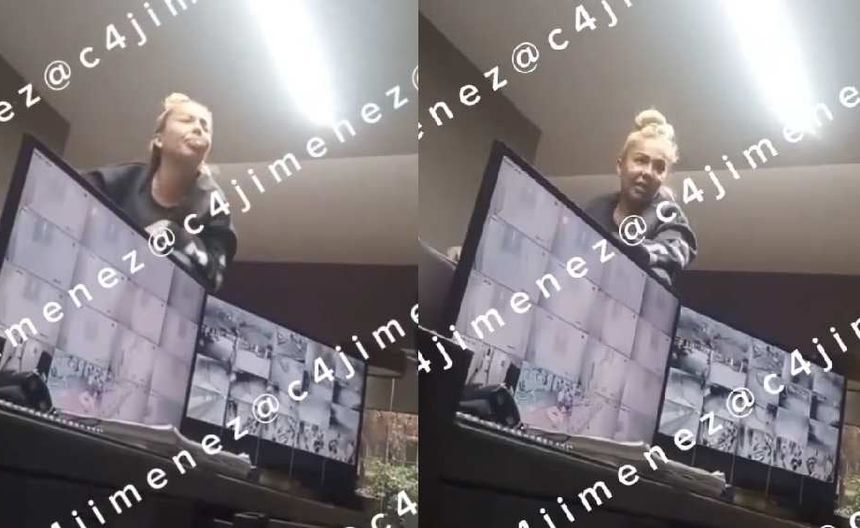 En los clips difundidos en redes sociales, se observa a la mujer sentada sobre la barra del lobby del edificio, escupiendo a un guardia y diciéndole: