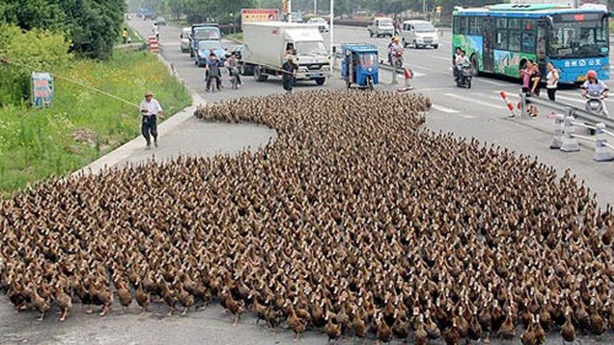 La nota curiosa se dio en China, cuando un granjero llevó a sus 5,000 patos a lo largo de la carretera en medio del tráfico para llevarlos a un estanque.
