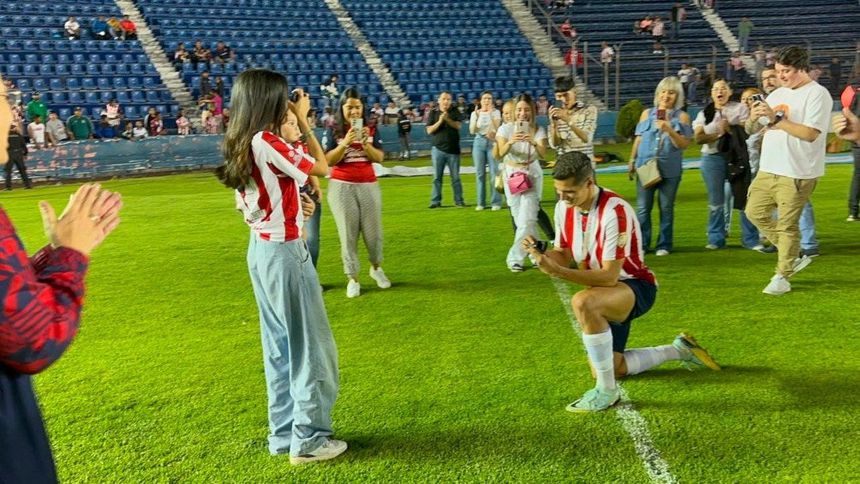Después de algunos segundos en espera de la respuesta, el jugador Rojiblanco recibió el 'sí' de su pareja y le colocó el anillo antes de abrazarla y compartir más demostraciones de afecto con ella.