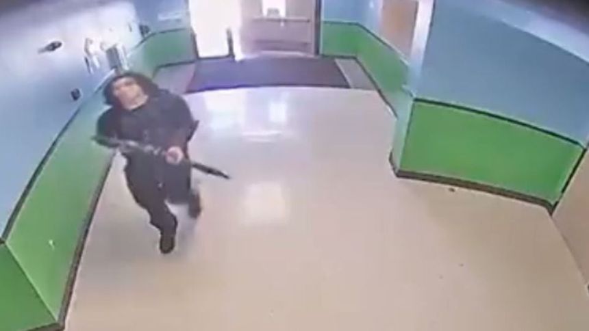 Las imágenes de una cámara instalada en el pasillo de la escuela muestran al agresor ingresando en el edificio con un fusil tipo AR-15 e incluyen la grabación de la llamada de un profesor al número de emergencias 911 en la que se le escucha gritar: “¡Al suelo! ¡Vayan a sus aulas! Vayan a sus aulas!”