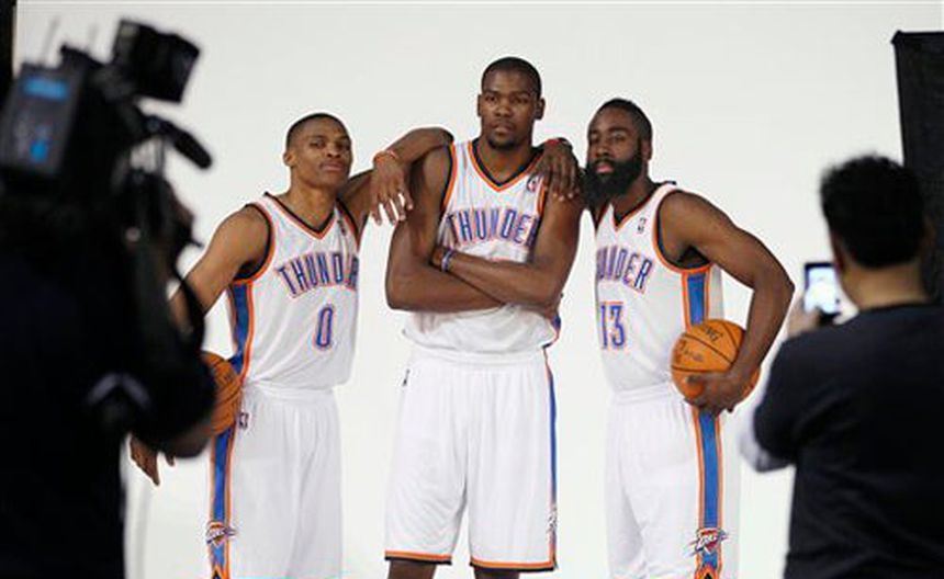Kevin Durant consiguió 21 puntos y 10 rebotes, el jugador reserva James Harden encestó 20, y el Thunder de Oklahoma City se convirtió en el primer equipo de la NBA que gana tres juegos en tres noches seguidas esta temporada al vencer el domingo por 108-96 a los Spurs de San Antonio.