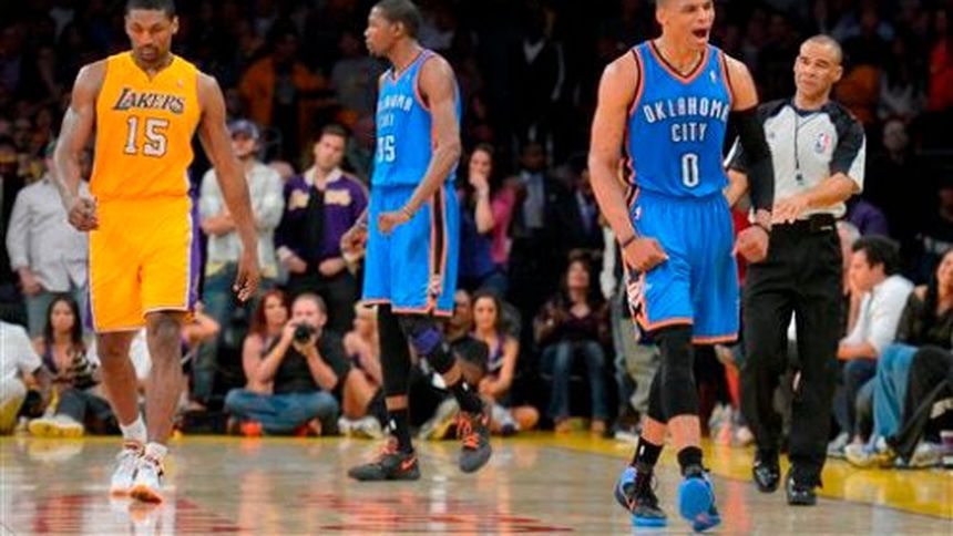 Russell Westbrook anotó 28 puntos, Kevin Durant aportó 25 y 10 rebotes y el Thunder de Oklahoma City se fue arriba en la segunda mitad para derrotar el lunes por 106-90 a los Lakers de Los Ángeles, a los que eliminaron de la postemporada en el quinto partido de la serie.