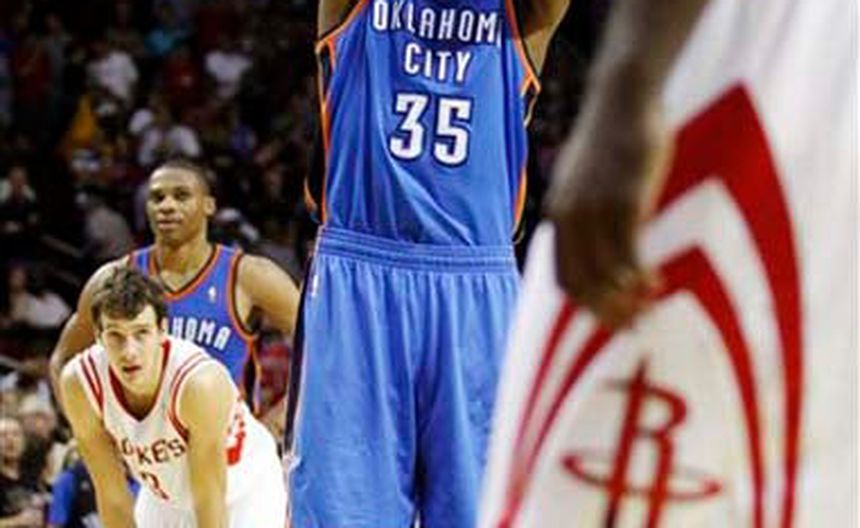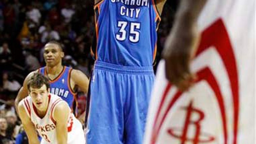 Durant terminó con 27 puntos y seis rebotes, Russell Westbrook agregó 25 puntos y seis asistencias, y el suplente Nazr Mohammed consiguió un récord de la temporada con 17 puntos y seis rebotes para el Thunder. Oklahoma City ganó su segundo encuentro consecutivo sobre Houston y jugará su tercer partido en días seguidos el domingo contra San Antonio.