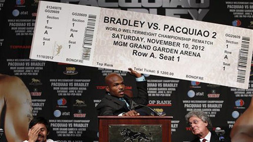 "Sacudiré al mundo del boxeo, le ganaré a Pacquiao y le daré la revancha el 10 de noviembre en la Arena Garden”, aseguró Bradley mientras mostraba un gigantesco boleto impreso con la leyenda "Bradley vs. Pacquiao 2” y el cartel de la función.