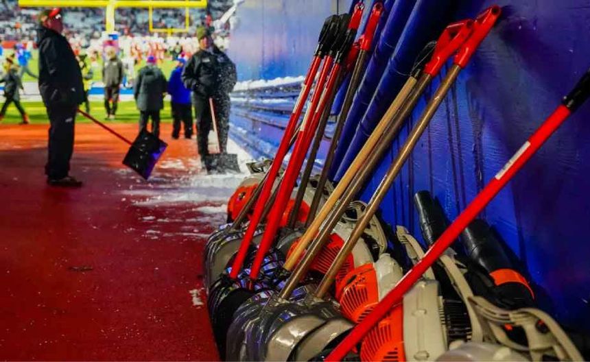 De acuerdo con reportes del clima, durante las siguientes horas estarán cayendo entre 1 y 3 pulgadas de nieves por hora. Ante esta situación el equipo ha solicitado la ayuda para mantener el estadio en buenas condiciones de cara al partido del domingo.