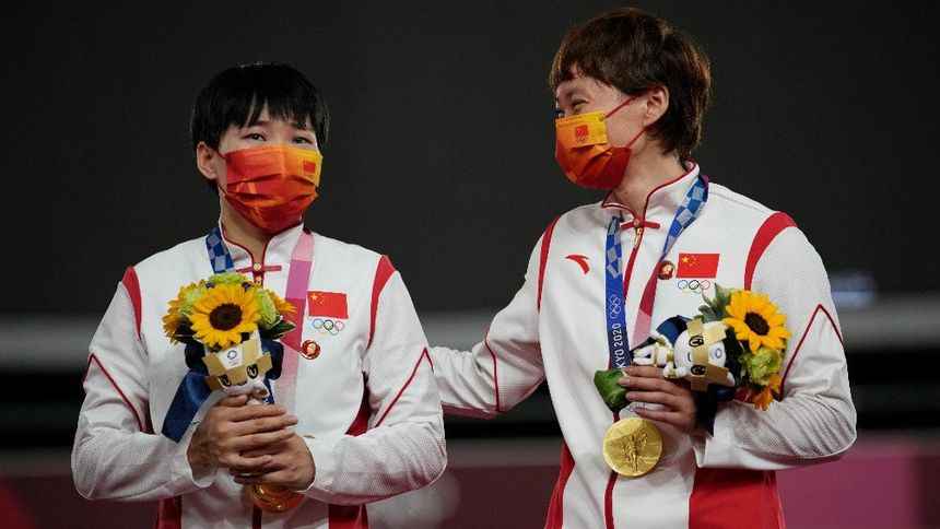 Las ciclistas Zhong Tianshi y Bao Shanju, que lograron el Oro en la prueba de velocidad por equipos el pasado lunes, subieron al podio en la ceremonia de entrega con unas insignias del fundador y primer líder (1949-1976) de la República Popular China decorando sus equipaciones.