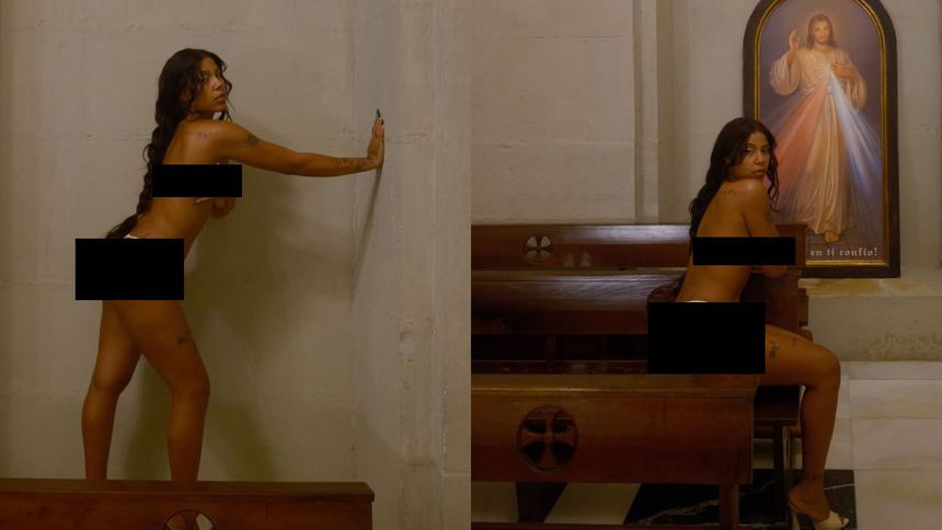 Según la demanda de la organización, la artista “aparece semidesnuda —en topless y vistiendo únicamente una prenda íntima— posando de forma provocativa dentro del templo”, situada directamente frente a una imagen de Jesucristo, “utilizando el espacio sagrado como escenario erótico completamente ajeno al culto religioso”.