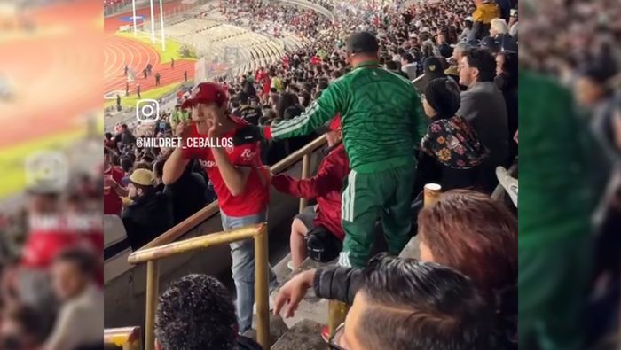 En un video compartido en redes sociales, se observa a dos aficionados del Toluca que se encontraban ubicados entre seguidores de Pumas. En las imágenes se aprecia cómo varias personas les arrojan vasos con cerveza y realizan expresiones agresivas mientras el partido aún estaba en desarrollo.