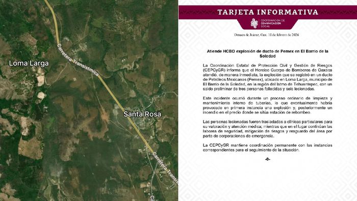 Otra tragedia más relacionada con Pemex sacudió a Oaxaca, luego de que una explosión registrada en un ducto en Loma Bonita Larga, municipio de El Barrio de la Soledad, provocó un fuerte incendio que dejó un saldo preliminar de tres personas fallecidas y seis heridas.