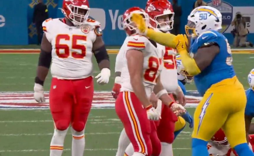 Travis Kelce es golpeado por defensivo de los Chargers en la semana 1