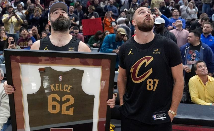 Travis y Jason Kelce, nacidos en Cleveland, estuvieron presentes el martes por la noche cuando los Cavaliers rindieron homenaje a las estrellas de la NFL con un muñeco de recuerdo que los representaba con camisetas de los Cavaliers y sosteniendo pelotas de baloncesto.