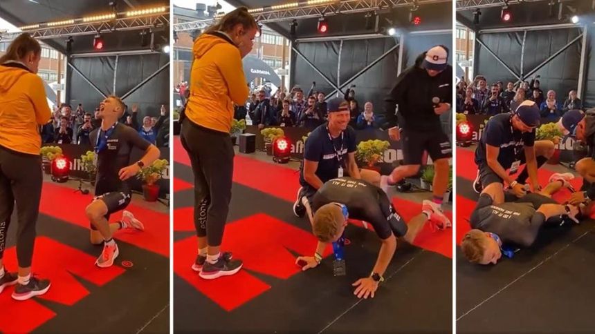 Triatleta español sufre calambre justo en el momento que se hincó para pedir matrimonio