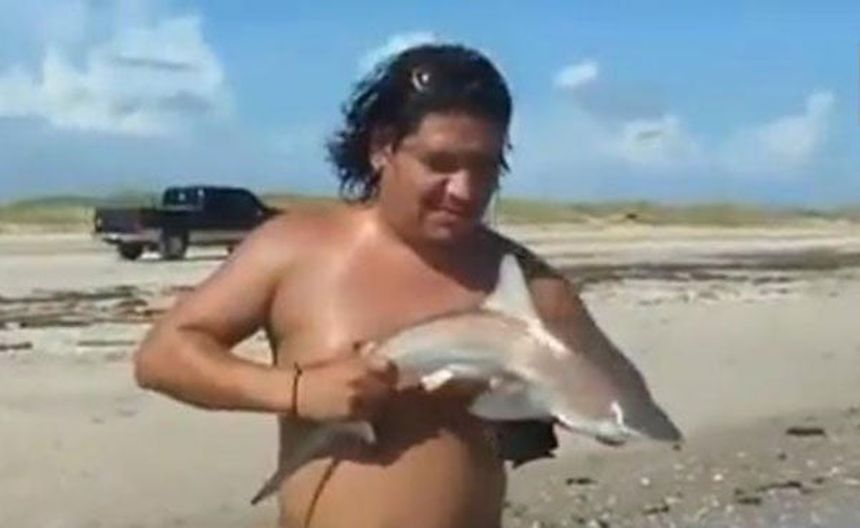 En un video, que se ha vuelto popular en la red, un turista posa, en la playa, sosteniendo a un pequeño tiburón, que al parecer acababa de ser pescado.