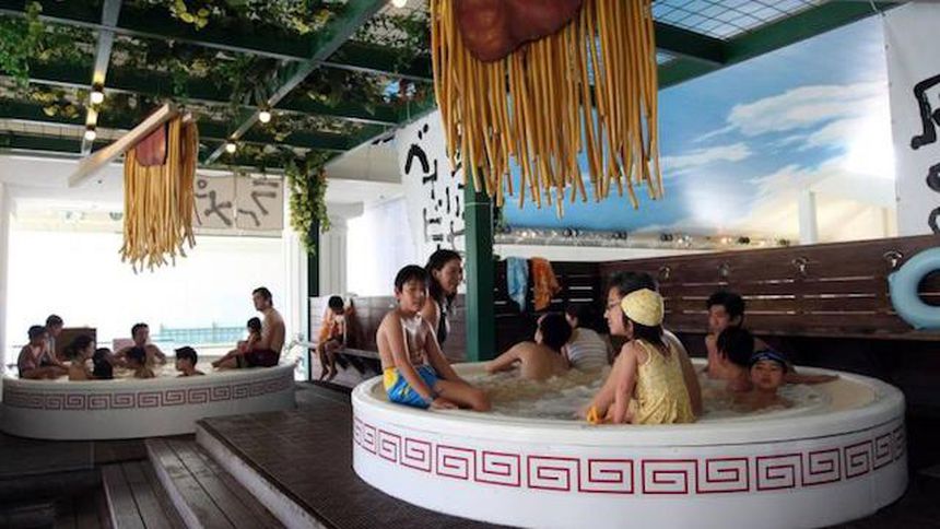 Turistas se sumergen en sopa de fideo en Spa japonés
