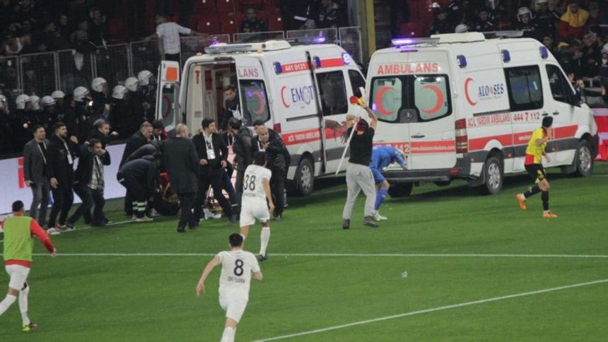 En este momento, 2 ambulancias ingresaron al campo ante la información de que había fanáticos heridos. El partido se detuvo en el minuto 22, fue en ese momento cuando un aficionado del Göztepe agarró un poste de córner y golpeó al portero del Altay. Ozan Evrim Özenç.