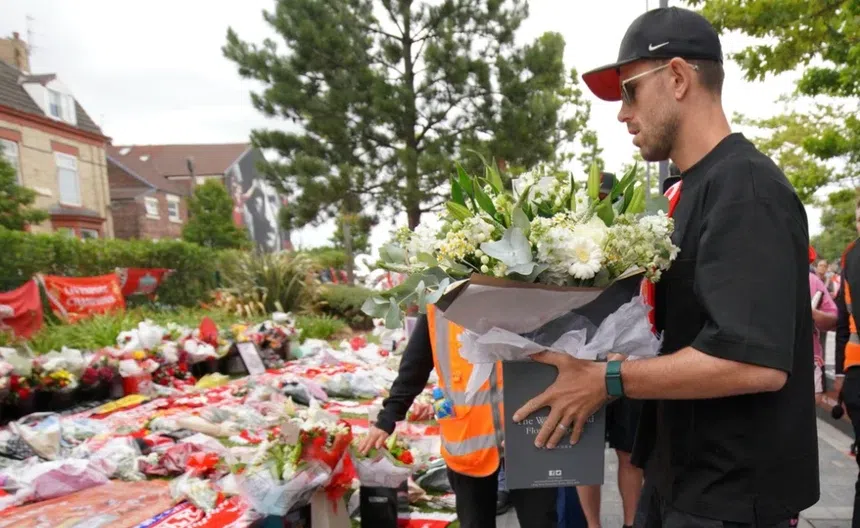 El excapitán de Liverpool, Jordan Henderson dejó una de las imágenes más duras al acudir a Anfield a rendir tributo. El mediocampista inglés dejó una bufanda y flores mientras derramaba lágrimas; además escribió en el libro de condolencias que el club abrió en homenaje a Jota y André.