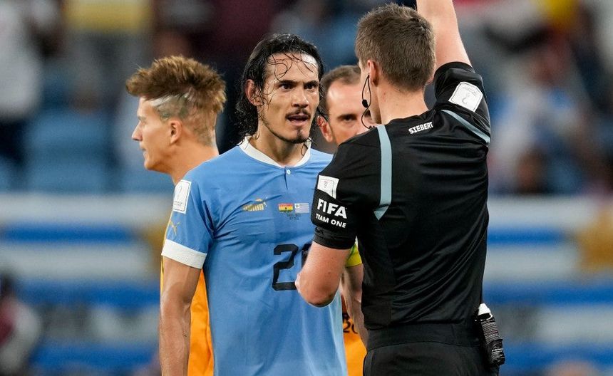 El delantero uruguayo, Cavani derribó una pantalla del VAR de un golpe cuando pasó por su lado tras finalizar el partido de Uruguay contra Ghana de la Copa del Mundo Qatar 2022.