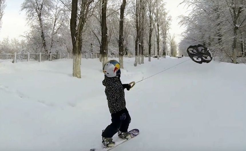 El usuario de YouTube, Valplushka, se le ocurrió subir un video en el que muestra a su hijo haciendo droneboarding, que consiste en colocarle a un dron una cuerda para sujetarlo y una tabla de snowboard, la cual se debe encontrar sobre una superficie con nieve.
