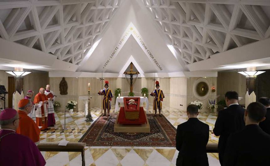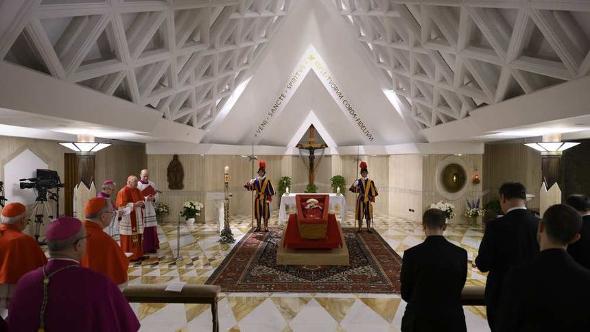 El Vaticano dio a conocer las primeras imágenes del papa Francisco en su féretro, tras su fallecimiento ocurrido el lunes 21 de abril a los 88 años. Las fotografías fueron tomadas en la capilla de la Casa Santa Marta, donde se preparó el cuerpo del pontífice para su velación. En las imágenes se observa al papa vestido con mitra blanca, sotana blanca, casulla roja y palio blanco, sosteniendo un rosario entre sus manos.