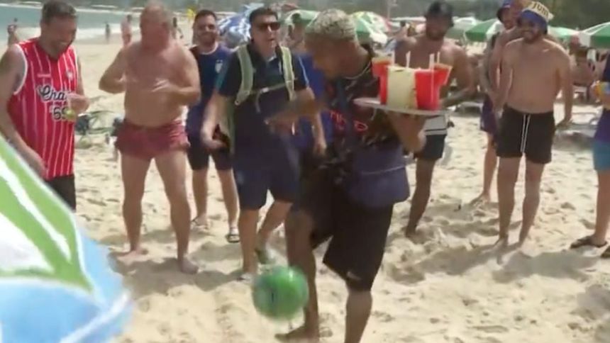 Sin embargo, el brasileño no solo aceptó el reto con maestría, sino que añadió un toque de espectáculo al equilibrar el balón mientras sostenía una bandeja llena de vasos de caipirinha con una mano. A pesar de las distracciones y pequeñas 'trampas' lanzadas por los argentinos circundantes, incluyendo arena y moviendo la bandeja con los vasos, el brasileño mantuvo su concentración. Sin embargo, esto no desconcentro al vendedor y, por el contrario, hizo una cabriola, todo el balón y pasó el pie por debajo dos veces.