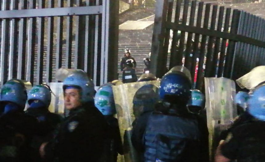 Sin embargo, los aficionados no se quedaron conformes y comenzaron a arrojar objetos e incluso tiraron una de las rejas que terminó en las escaleras y otra parte fue detenida por los policías.