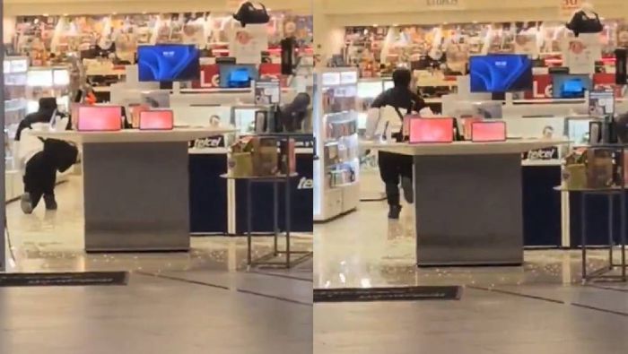 Incluso, uno de ellos resbala y cae al piso mientras intenta huir con los objetos robados.