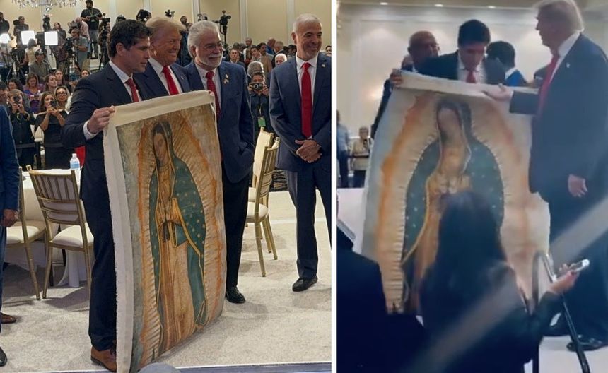 Durante un evento para ganar el respaldo de la comunidad latina en Florida, Donald Trump fue sorprendido al momento en que le regalan una imagen de la Virgen de Guadalupe.