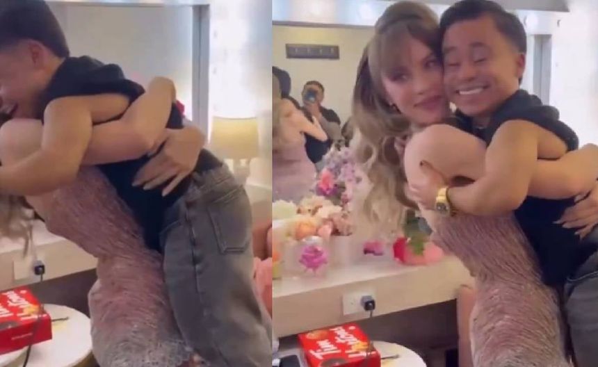 Las risas y aplausos a la peculiar escena fueron evidentes, así como la conexión de ambas personalidades, posando después en otra fotografía que muestra también el ramo de rosas que Abelito llevó a Belinda.